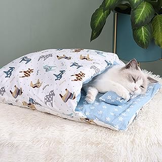 Enerhu 猫布団 枕付き 猫寝袋ベッド ふわふわ 猫用寝袋 冬用 猫ベッド 暖かい 猫 寝袋 犬用 ペットベッド クッション 猫ハウス ふとん キャットハウス ベッド 布団 マット 半密閉式 洗える 保温防寒 #2 L